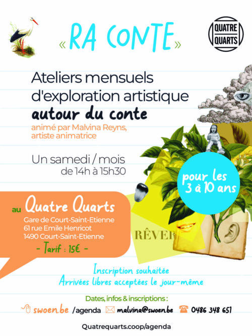 Atelier destiné aux enfants de 3 à 10 ans. Après la lecture d’un livre jeunesse, les enfants s’en inspirent pour créer leurs propres histoires. Un moment pour inventer, explorer des techniques et rigoler ! Techniques utilisées : dessin, collage, montage, peinture et reliure. Pas de niveau scolaire requis. Les « différences » sont les bienvenues. Animés… Poursuivre la lecture Ra Conte – Exploration artistique Enfants