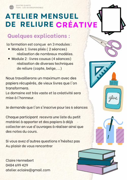 Janvier à Juin 2026 2ème mardi du mois De 13h30 à 16h30 13/01, 10/02, 10/03, 14/04, 12/05 et 9/06 Exploration de nombreuses techniques avec de la récup, facile à refaire chez soi. Prix: Entre 10 et 15€ par séance Inscription obligatoire pour tout le cycle : Claire Hennebert : atelier.eclaire@gmail.com - 0484 699 429